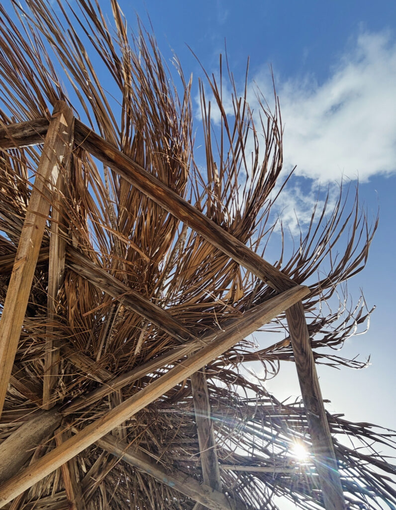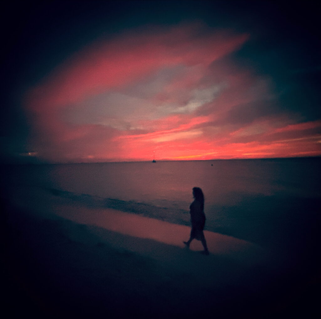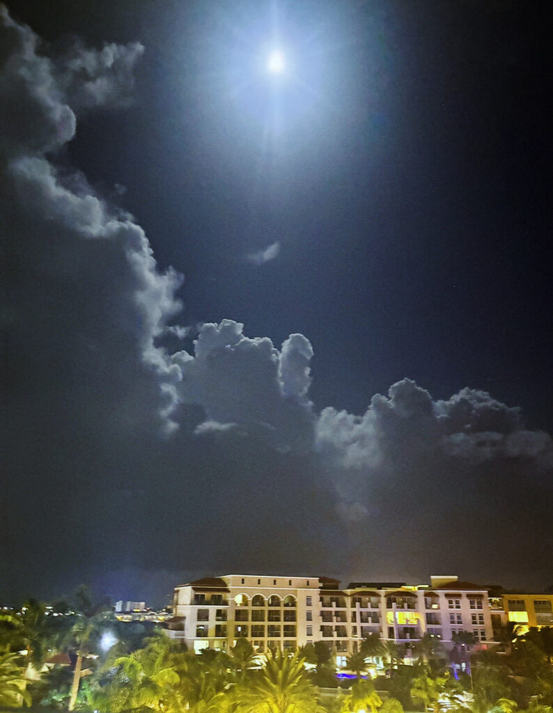 Inside the night the clouds definitely moved in. They appeared to make a magical fluffy frame around the moon. Below, the stucco resorts, palm trees green lit by electric lights. More distant lights also. Then, it is the rain’s turn to act. Slow dawn and early morning showers. Then the perennial ‘torrential’ downpour, but that’s okay. The cars scatter. The trees become frumpy. The sand turns a darker shade, brownish. Maybe later it will stop and the bright rays of light will come again,- warm, nurturing, healthy, joyous, calm, kind,-