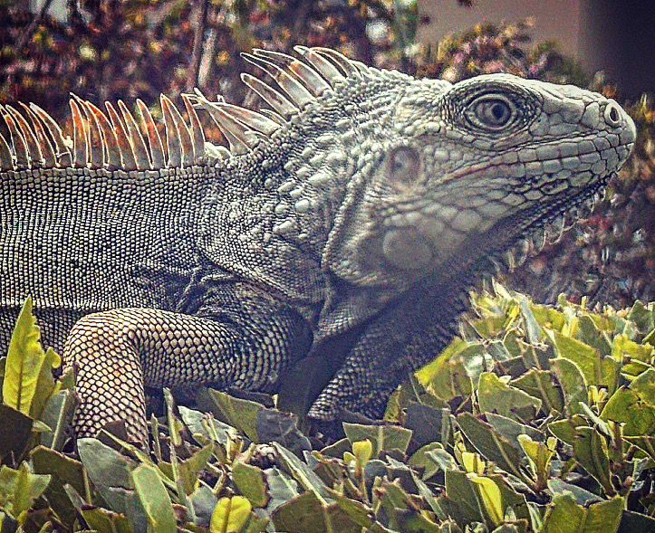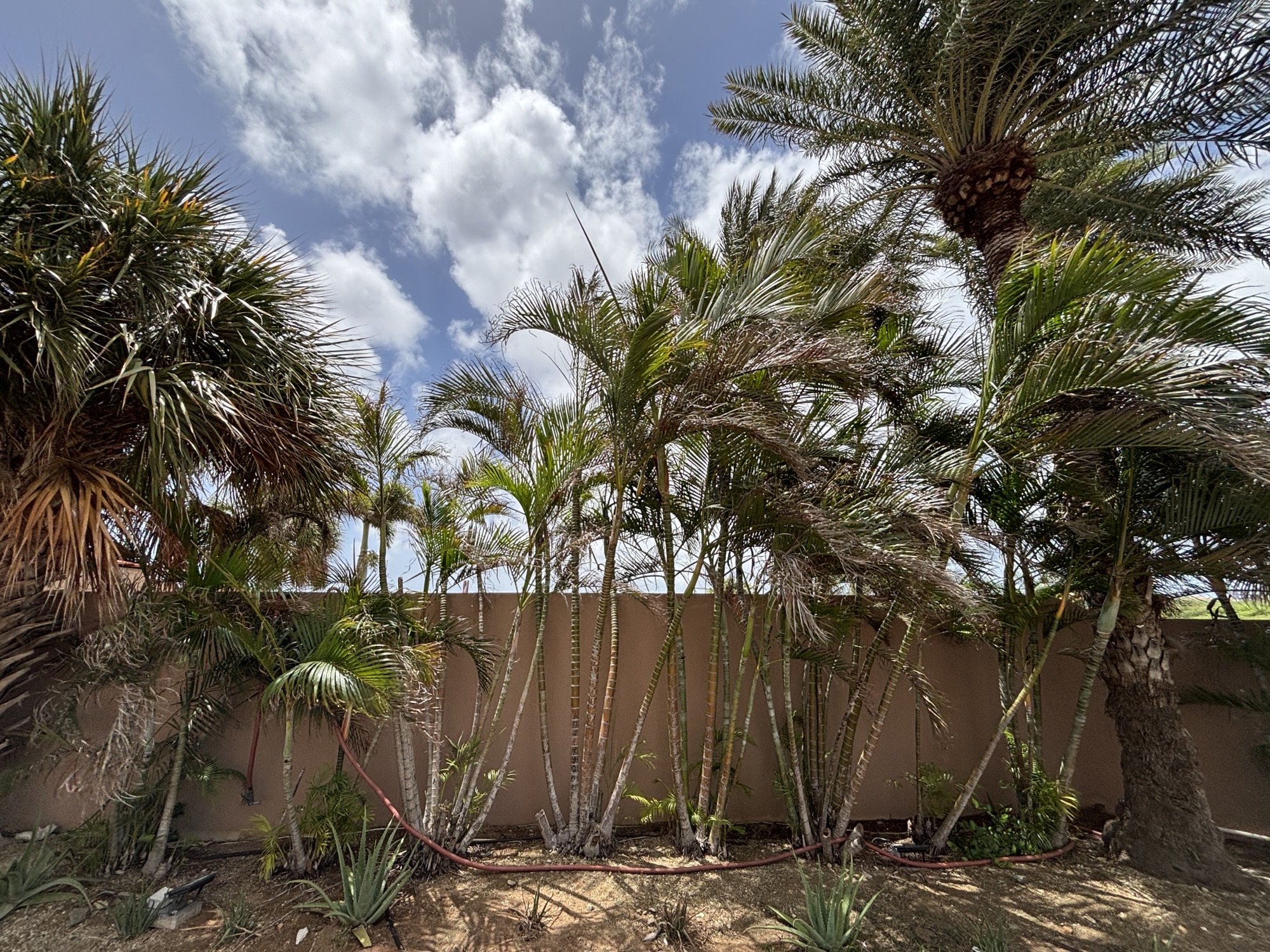 Dawn brightly announces itself and the winds that have remained travel through the worlds of verdant palm fronds and the stucco buildings. A blue lizard, a gecko, my favourite type, watches, plus a green one beyond. There is the pool, plus the green grasses where cats play and friendly tourists feed them.