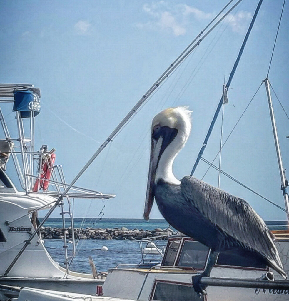 A bird begins to sing. Eventually more. A pelican arrives up the way as every day, in order to look at a certain set of balconies or the roof. Terra cotta condominiums, green fronds, potted trees, the Divi Divi trees, coastline, looking southwest for the trade winds that travel across the region. The parrot that arrives the first day to great Tara hasn’t been back, and though real is more like a spirit message, an auspicious sign of some sort. (Things like this often happen to her, especially w/birds. The birds sense her spirit and essence and like her very much).
